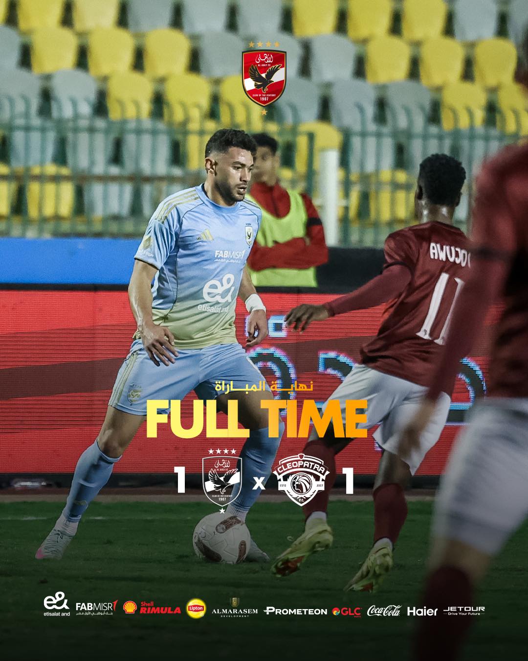 فرض فريق سيراميكا كليوباترا التعادل الإيجابي بهدف لكل فريق على النادي الأهلي، في المباراة التي جمعت بينهما على ستاد المقاولون العرب، ضمن منافسات بطولة الدوري المصري الممتاز موسم 2025-2026. افتتح سيراميكا كليوباترا التسجيل في الدقيقة 39، عن طريق اللاعب فخري لاكاي، بعدما أطلق تسديدة قوية من خارج منطقة الجزاء فشل الحارس مصطفى شوبير في التعامل معها لتسكن الشباك. في المقابل، لم يظهر الأهلي بالشكل الهجومي المنتظر خلال أغلب فترات اللقاء، ولم يتمكن من تهديد مرمى الحارس محمد بسام بشكل حقيقي، قبل أن يتمكن ياسر إبراهيم من إدراك التعادل في الدقيقة 81، بعد متابعة ناجحة لكرة ركنية داخل منطقة الجزاء. وشهدت الدقائق الأخيرة من المباراة حالة من الجدل، بعدما طالب لاعبو الأهلي باحتساب ركلة جزاء إثر لمسة يد على أحد مدافعي سيراميكا، إلا أن حكم اللقاء رفض احتسابها بعد العودة لتقنية الفيديو (VAR). وبهذه النتيجة، رفع الأهلي رصيده إلى 41 نقطة في المركز الثالث بجدول ترتيب الدوري، بينما وصل سيراميكا كليوباترا إلى 39 نقطة في المركز الرابع.