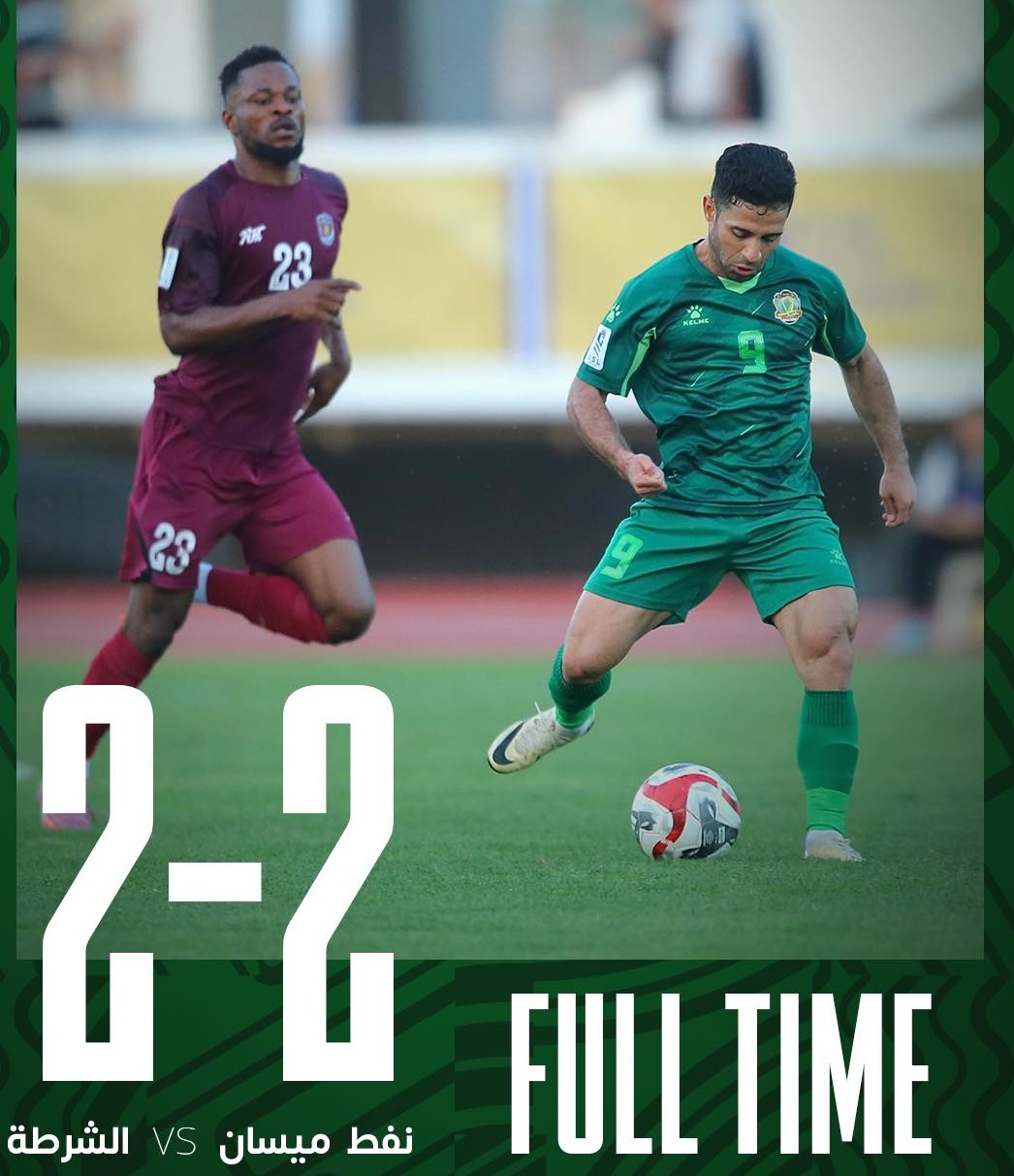 خطف نفط ميسان تعادلا في الدقائق الأخيرة مع ضيفه الشرطة 2-2، ضمن منافسات الجولة 31 من الدوري العراقي لكرة القدم. ورفع الشرطة رصيده إلى 64 نقطة في المركز الثاني، بفارق ست نقاط خلف المتصدر فريق القوة الجوية، والذي يلعب الاثنين مع مضيفه نوروز ضمن منافسات الجولة ذاتها. على الجانب الآخر، رفع نفط ميسان رصيده إلى 27 نقطة في المركز الثامن عشر. وتقدم الشرطة في الدقيقة 30 عن طريق عبدالرزاق قاسم، ثم أدرك نسيم صيود التعادل لنفط ميسان في الدقيقة 71. وفي الدقيقة 81 سجل دومينيك ميندي الهدف الثاني لفريق الشرطة، وبينما كانت المباراة تتجه نحو فوز الشرطة، سجل رضا محمد حاجم هدف التعادل لنفط ميسان في الدقيقة السادسة من الوقت بدل الضائع للشوط الثاني. وشهدت المباراة تعرض ريوان أمين لاعب الشرطة للطرد، وذلك قبل دقيقة واحدة من تسجيل نفط ميسان لهدف التعادل.